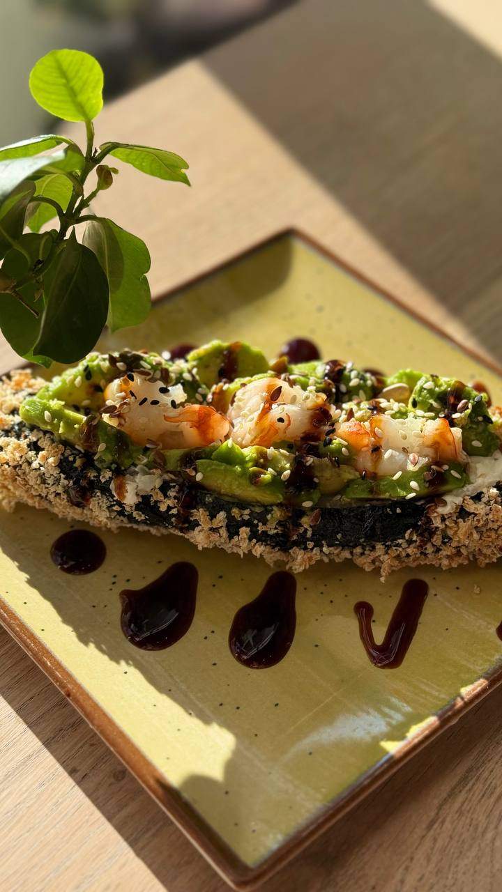 Скрамбл з лососем та авокадо. Подається з круасаном та крем-сиром